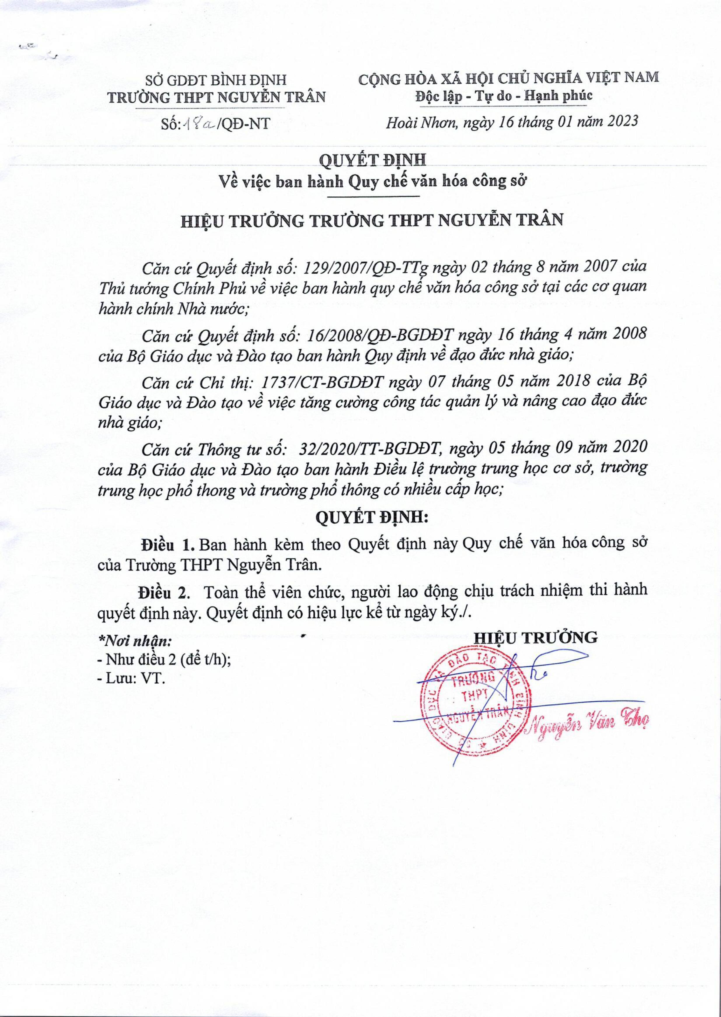 QUY CHẾ VĂN HÓA CÔNG SỞ CỦA TRƯỜNG THPT NGUYỄN TRÂN