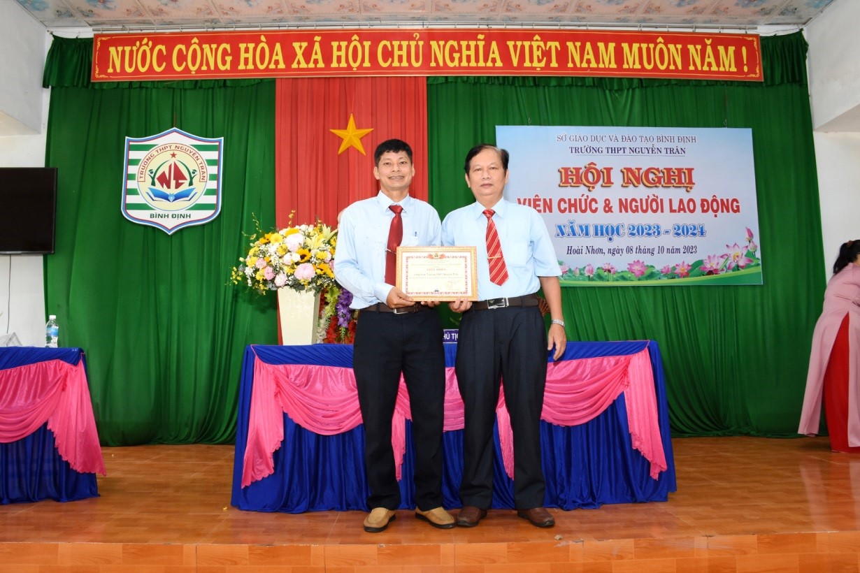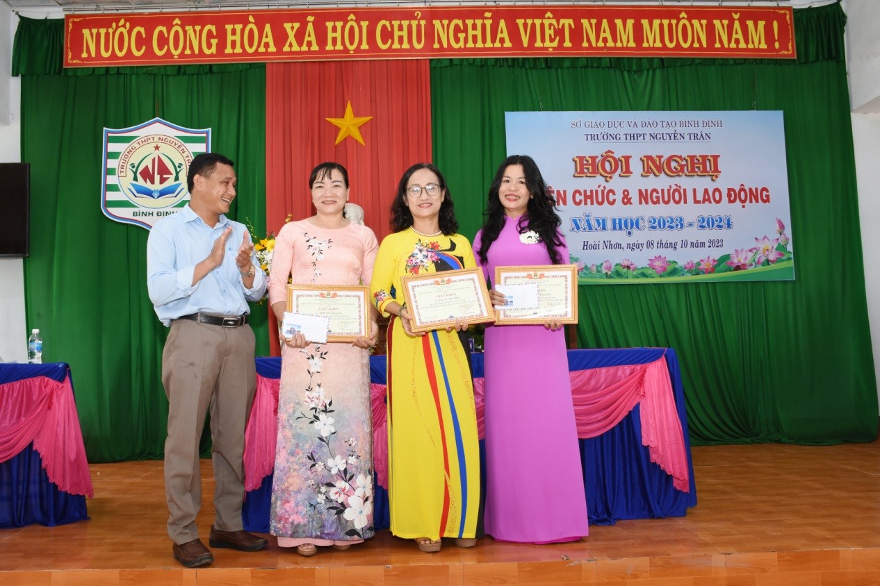 Thầy Trịnh Minh Tẩn – P.Hiệu trưởng, trao Giấy khen của Công đoàn ngành cho 03 công đoàn viên đã hoàn thành tốt nhiệm vụ Công đoàn