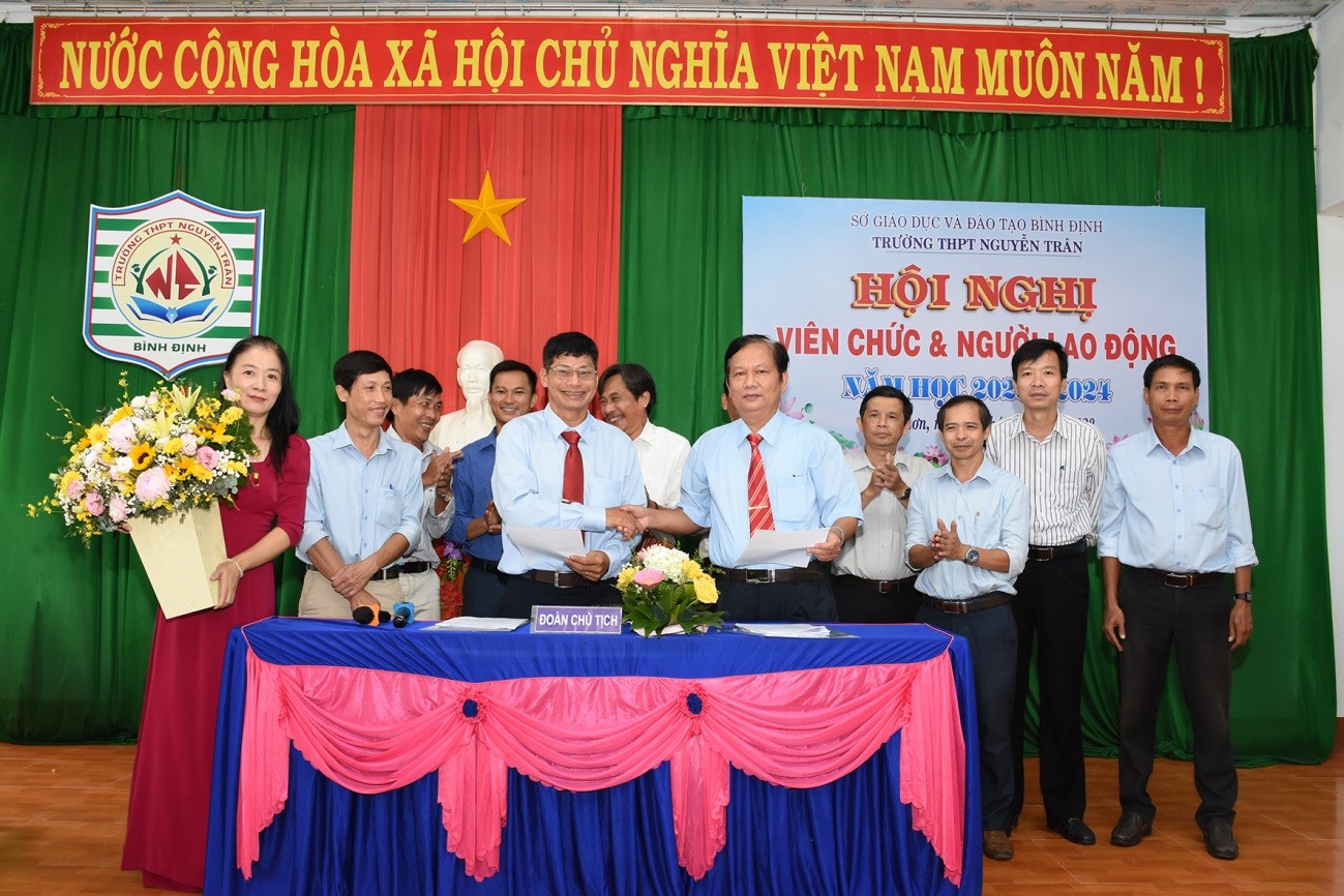 Tại Hội nghị, thầy Nguyễn Văn Thọ, Hiệu trưởng nhà trường cùng thầy Nguyễn Hồng Sơn, Chủ tịch Công đoàn đã ký giao ước thi đua năm học 2023- 2024 trước sự chứng kiến của các Tổ trưởng và Bí thư Đoàn trường.