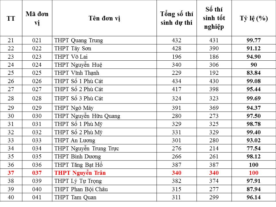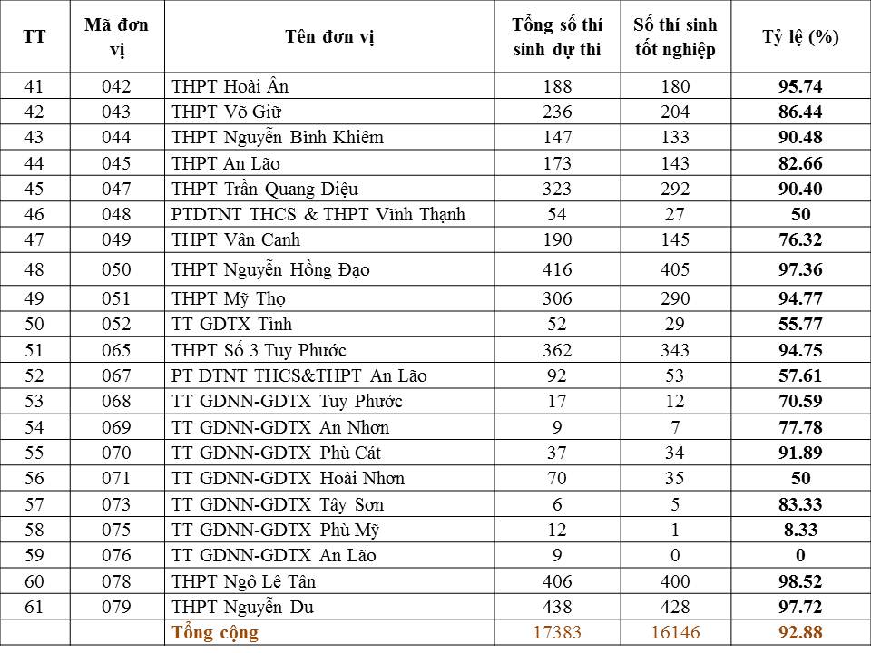 Theo thống kê của Phòng Khảo thí và Quản lý chất lượng giáo dục (Sở GD&ĐT), những trường có tỷ lệ học sinh được xét công nhận tốt nghiệp đạt 100% gồm: Trường Quốc học Quy Nhơn, Trường THPT chuyên Lê Quý Đôn, Trường THPT Tăng Bạt Hổ, Trường THPT Nguyễn Trân. Theo đó, có 16.146/17.383 thí sinh được xét công nhận tốt nghiệp (chiếm 92,88%).